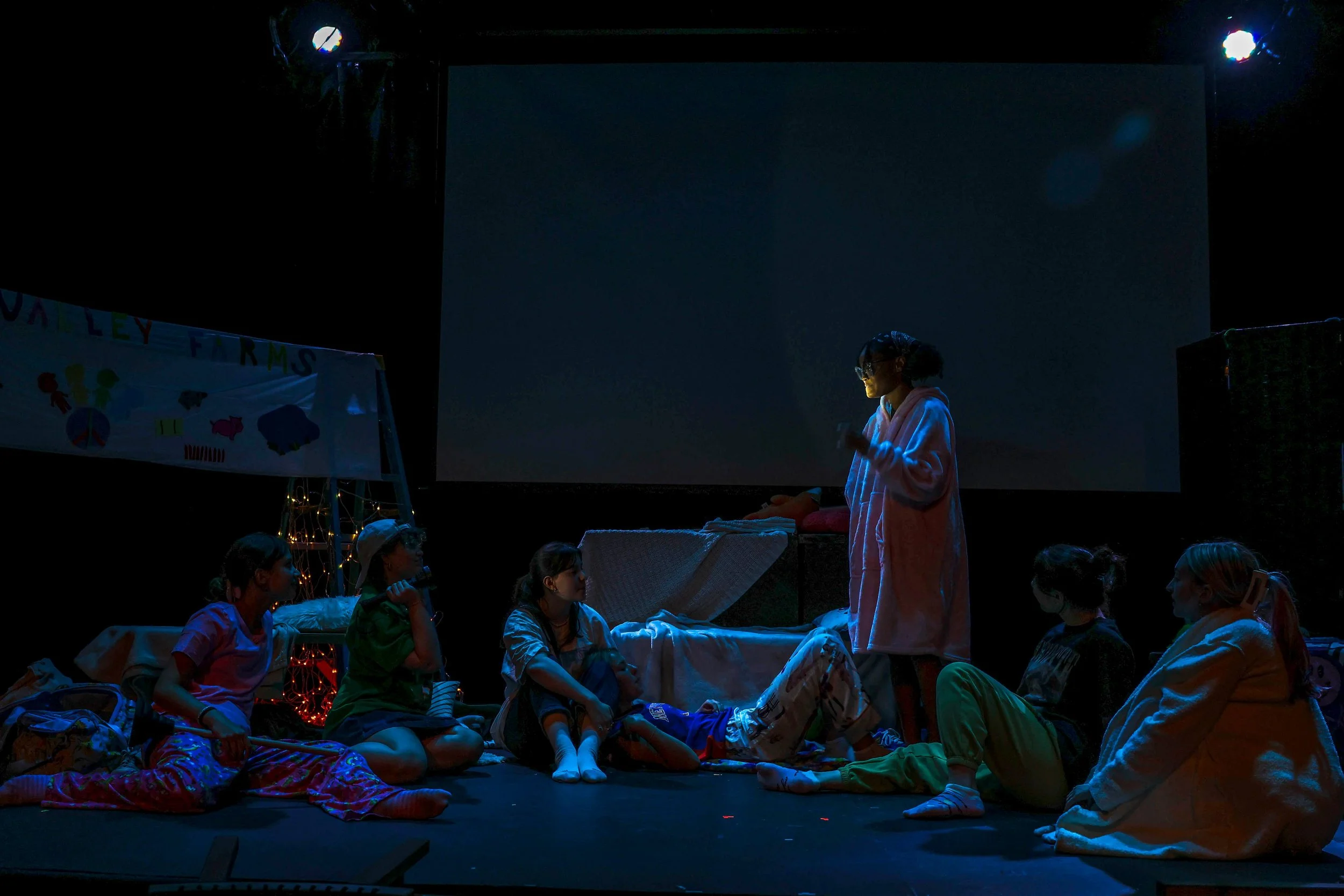 There are no cell phones allowed at Peace Valley Farms, where sophisticated urbanites send their children to milk cows and live out their back-to-the-land fantasies. The girls of Sycamore cabin don’t mind, though. They just learned about manifesting, and they’ve got intentions to set. It’s the summer after sixth grade, and the seven Sycamore girls spend it terrorizing and taking care of one other as they navigate crushes, periods, gangrene, and bunny murder. Written by a veteran middle school teacher and starring a teenage cast, You Need Help explores the tension between safety and freedom, the interdependence of all living things, and what it means to seek control when even your own body is in chaos.